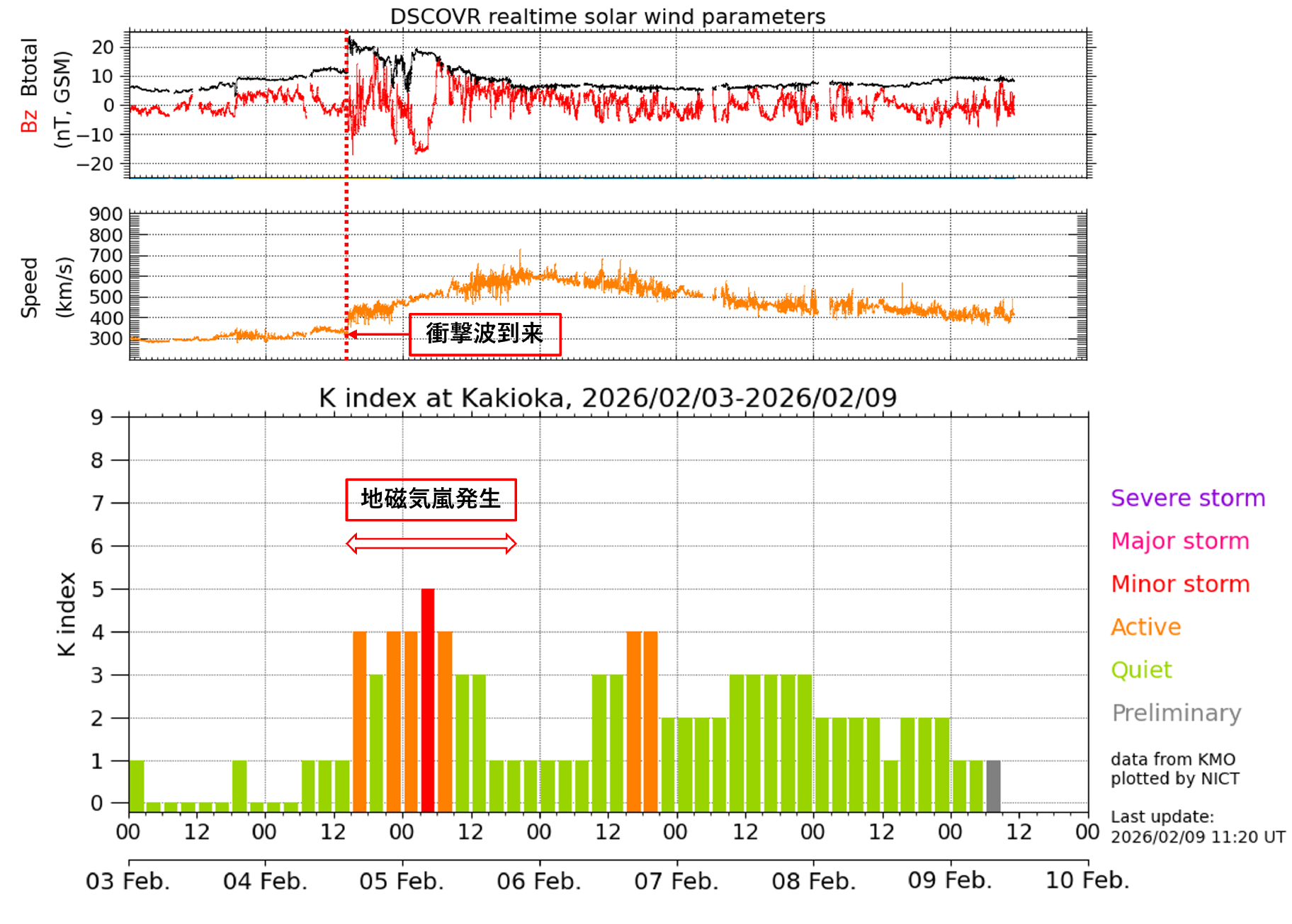 図4:探査機DSCOVRによる2月3日~9日UTの太陽風磁場(上段)と太陽風速度(中段)の観測値、および気象庁地磁気観測所(柿岡)のK指数(下段)。K指数は地磁気変動の活動度を表す指数の1つ。
