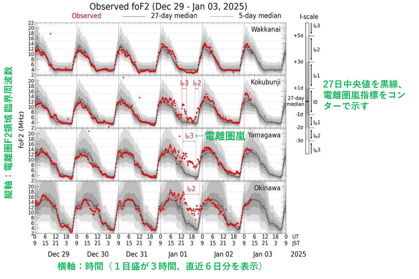 国内4か所の電離圏観測装置(イオノゾンデ)*1で観測されたF2領域*2臨界周波数(foF2)*3の時間変化を示しています。 図は上から稚内(北海道)、国分寺(東京)、山川(鹿児島)、大宜味(沖縄)の観測です。 foF2はF2領域の電子密度と連動して増減します。 電離圏の電子密度は、昼間に大きく、夜間に小さくなります。 さらに、場所・季節・太陽活動によっても変化し、磁気嵐に伴う顕著な乱れ(電離圏嵐)も起こります。 NICTでは「電離圏嵐指標(I-scale)」を用いて電離圏嵐の発生を判定しています。 この指標は、過去27日間の中央値(図中の黒線)に比べて、観測値(図中の赤点)がどれだけずれているかを統計的な尺度(図中のグレーコンター)で示します。 電子密度が増加する嵐をIP1~IP3、電子密度が減少する嵐をIN1~IN3で表します(数字が大きいほど規模が大きい)。