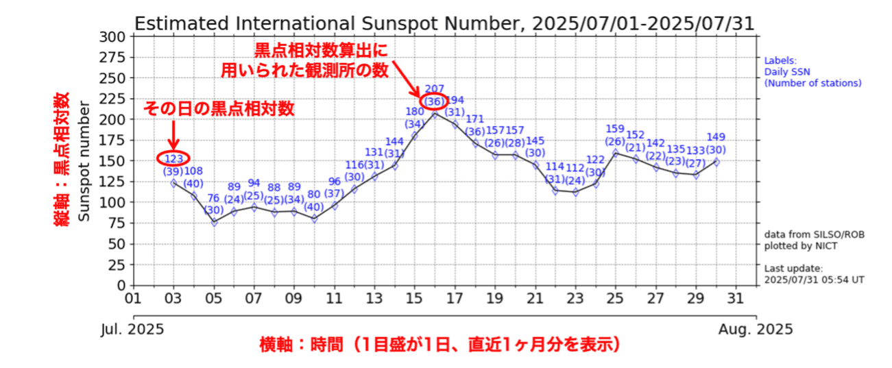 グラフの青字の数値が、ベルギー王立天文台が公表した黒点相対数の値、
